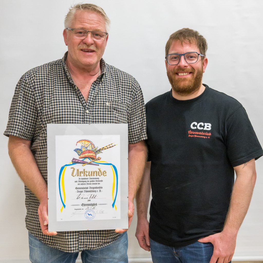 Vorstandschaft hat er sich verdient gemacht – auch auf der Bühne war er präsent. Außerdem stand er in der Session 1985/1986 als Prinz im Mittelpunkt des Geschehens. Wer ihn kennt, weiß: Auf ihn ist immer Verlass. Ob beim Auf- und Abbau, am Stand, auf der Bühne oder hinter den Kulissen – er ist zur Stelle, wenn Hilfe gebraucht wird. Mit viel Herzblut hat er über Jahre hinweg die Bühnenbilder gestaltet und dabei so manches Meisterwerk geschaffen. „Und wenn man denkt, mehr Einsatz geht nicht, hier noch eine kleine Geschichte aus letztem Jahr“ fuhr der 1. Vorsitzende fort. Ohne zu zögern stellte Werner Roth seinen Garten, das Café Frei, für das Lampionfest zur Verfügung und bescherte dem Verein damit eine wunderschöne neue Location! Kurz gesagt: Einer, der nicht lange fragt, sondern einfach macht. Einer, der den CCB lebt. Deshalb wurde Werner Roth unter großem Beifall als neues CCB Ehrenmitglied ernannt.